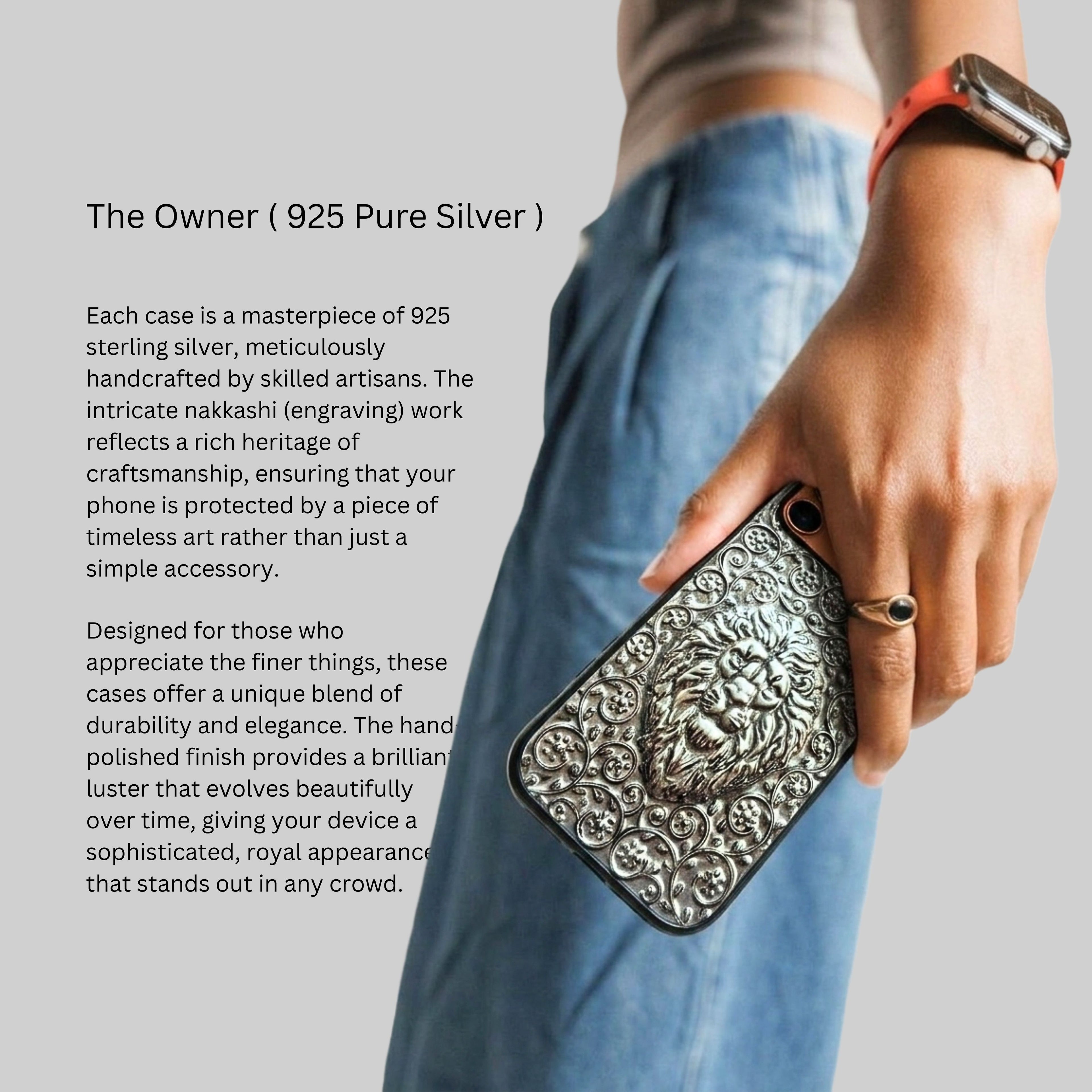Pure German silver phone cases featuring intricate handmade नक्काशी, meticulously crafted by skilled artisans to create a timeless luxury piece that truly stands apart from ordinary phone cases.